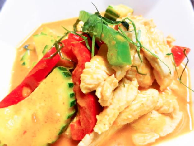 Marinated chicken on skewers. Served with peanut sauce and cucumber salad.