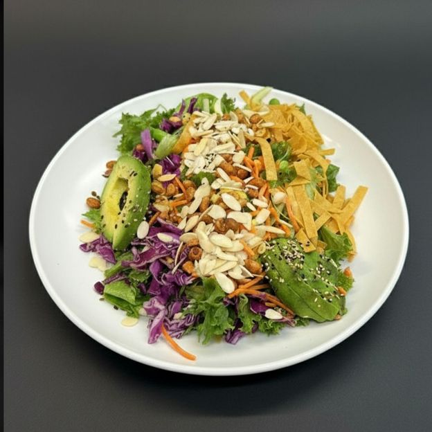 Mixed greens, red cabbage, carrots, edamame & crunchy wonton strips, avocado, roasted corn. Topped with toasted sesame seeds, sprinkle of sliced almonds & chopped peanuts