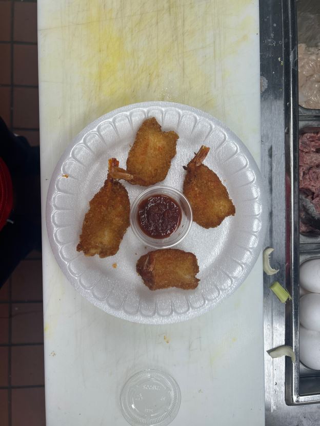 2 egg rolls, 2 chicken teriyaki, 2 BBQ spare ribs, 2 chicken wings, 2 crab Rangoon, 2 fried jumbo shrimp.