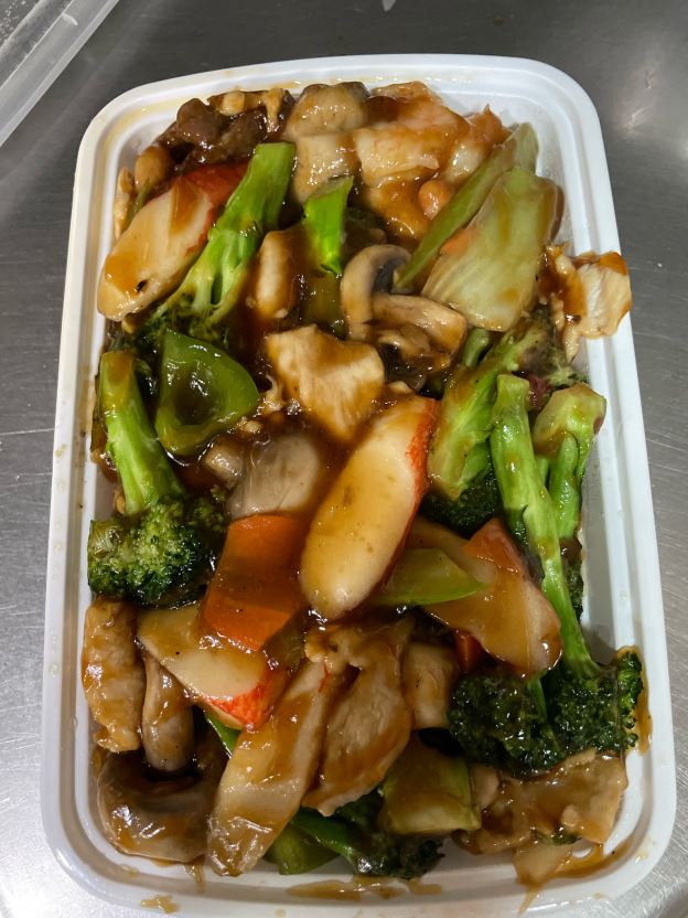 A mixed of shrimps, scallops, beef, chicken breast blended w. bamboo shoots, mushroom, broccoli in a Delicious Brown Sauce