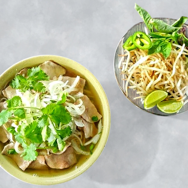 Pho Noodle Soup with thin Ribeye Steak, Brisket, and shredded Chicken Breast