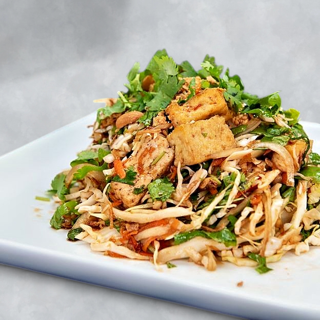 Chicken or Tofu Cabbage Salad mixed with Daikon,and topped with Cilantro, Peanuts, Chili, Lemon Juice, and Basil