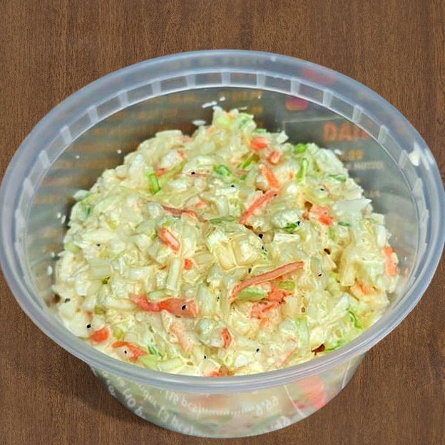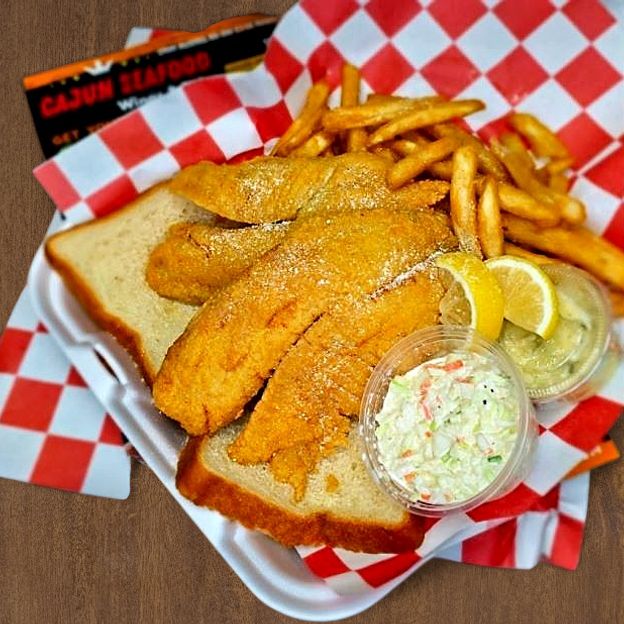 A crispy golden fish fillet served on a toasted white bread, fresh coleslaw, and creamy tartar sauce. Paired with crispy fries