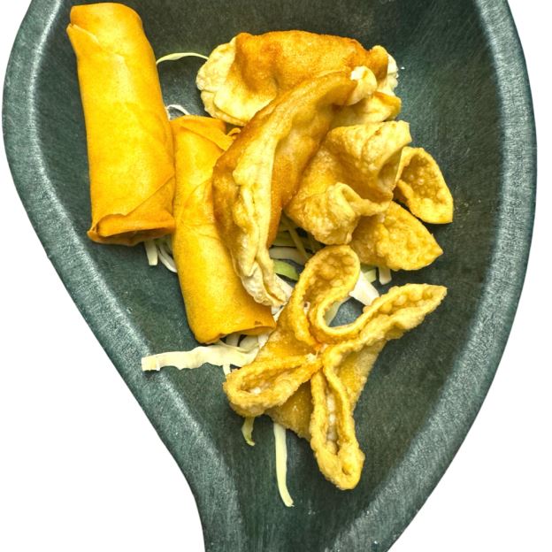 $7.99 Per person, minimum order of 2; Egg Roll, Crab Cheese Wonton, , Fried Shrimp, Beef & Chicken on Skewers
