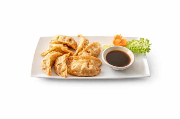 Pot sticker. Pan-fried ground vegetables dumplings served with vinegar soy sauce.