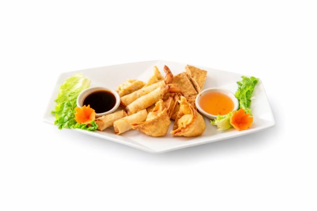 Two crab Rangoon, two fried wontons, two shrimp in the blanket, two gyoza and four baby egg rolls.