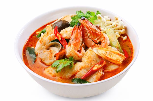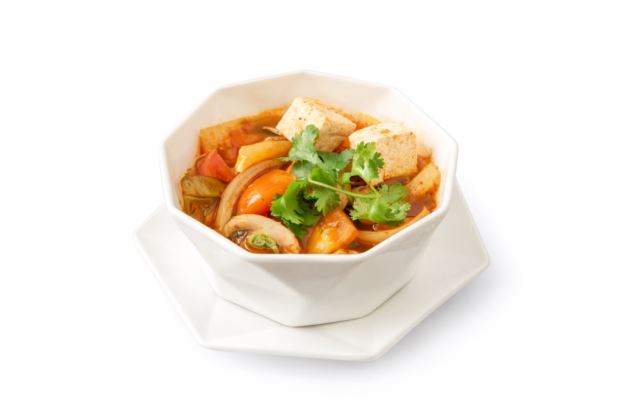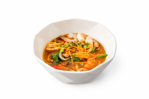 Thai hot and sour soup with mushrooms in a tart lime broth seasoned with lemon grass and hot pepper. Hot and spicy.