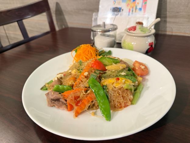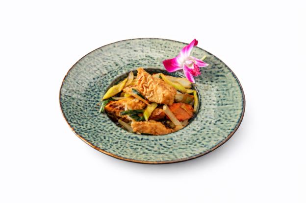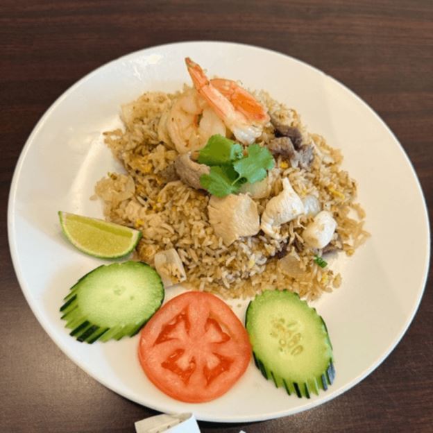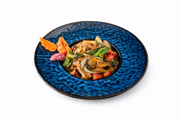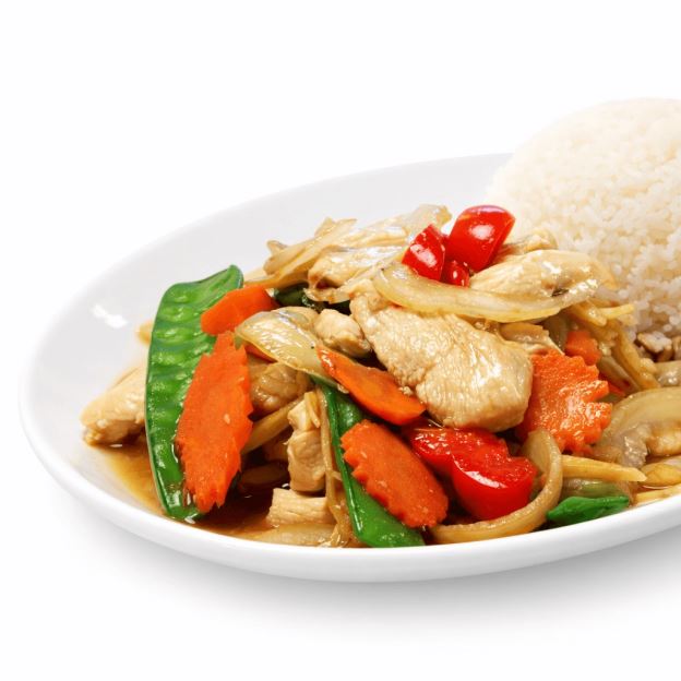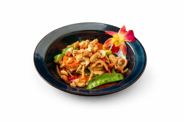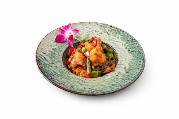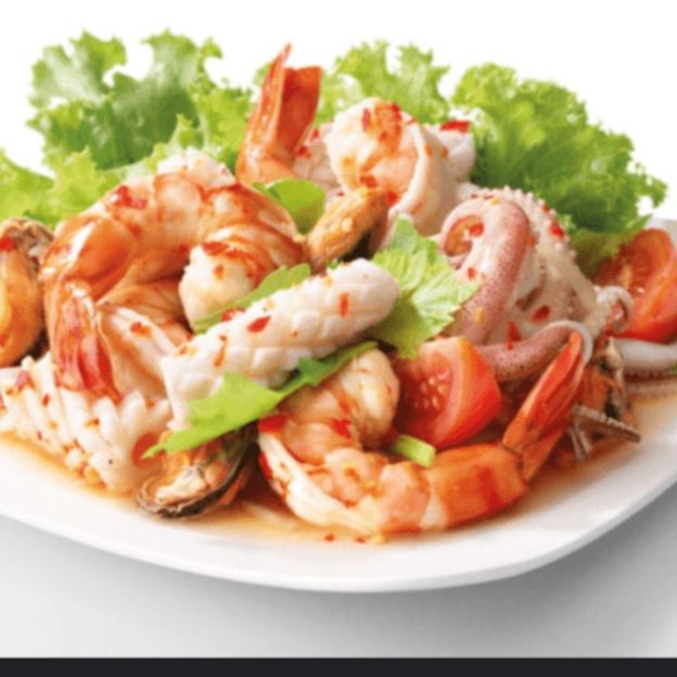 Shrimp, squid, mussels, and scallops stir fried with peapods, carrots, bell peppers, and bamboo shoots in a special chili paste, Hot and spicy.
