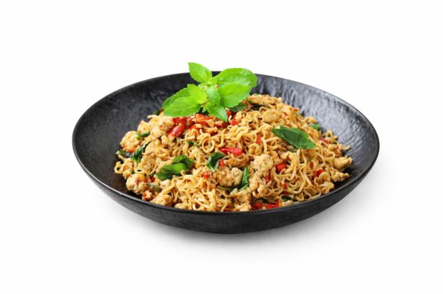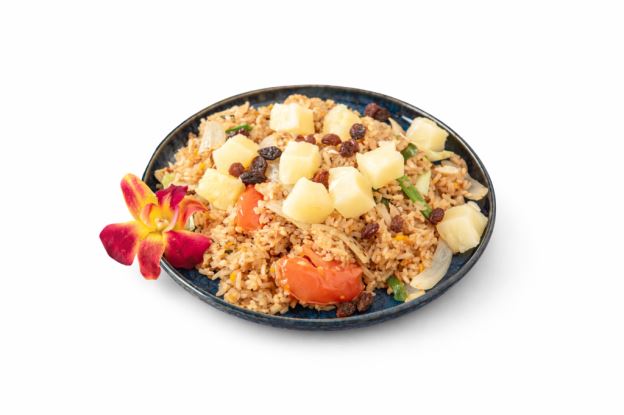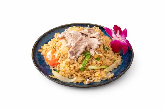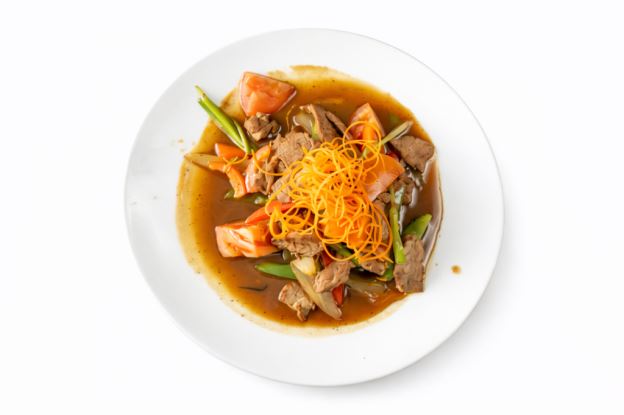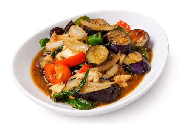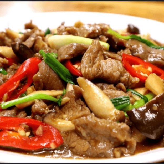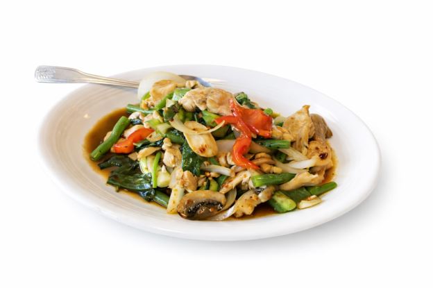 Shrimp, squid, mussels, and scallops stir-fried with basil leaves, onion, green beans, mushrooms, hot and bell peppers. Hot and spicy.