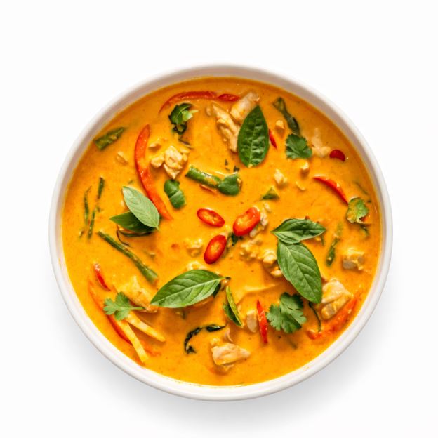 Coconut soup. Meat in spicy coconut soup simmered in a coconut milk spiced with Thai ginger, hot peppers and lime juice. Hot and spicy.