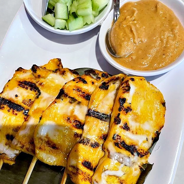 Marinated chicken or tofu with Thai spices on skewers. Served with Thai peanut sauce and cucumber salad on the side.