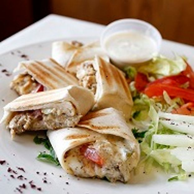 Grilled diced chicken, topped with aladdin's special garlic sauce, plus, tomatoes and imported pickles, wrapped in a large tortilla and toasted.