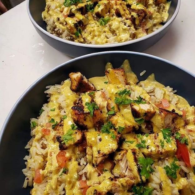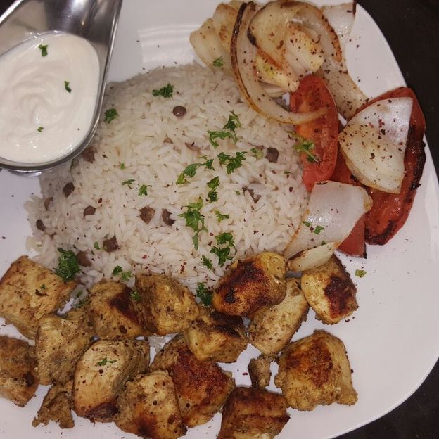 Grilled Chicken Strips on a bed of Rice, with Tomatoes, Pickles, and Garlic Sauce.