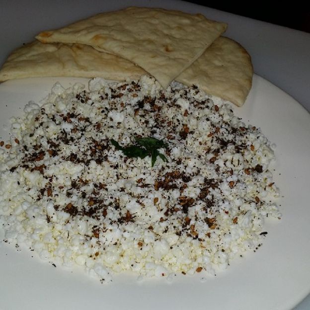 Aladdin's fresh labneh on a toasted pita bread, topped with extra virgin olive oil, and fresh cucumber slices.