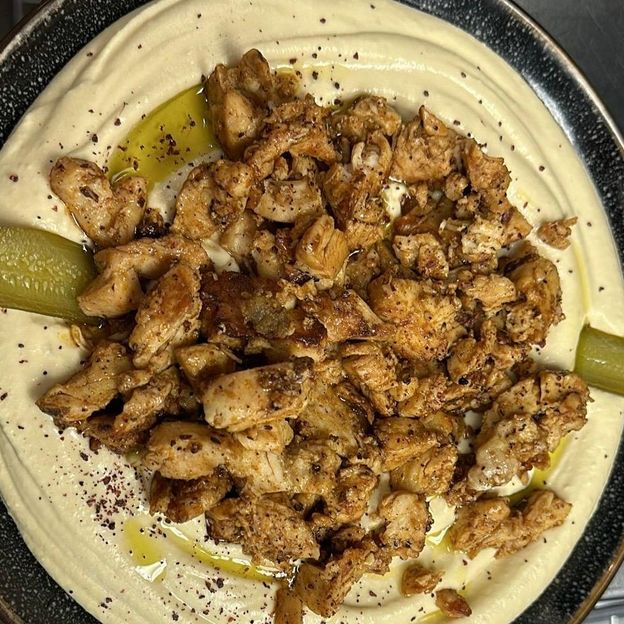 Chicken shawarma wraps conveniently cut to share, comes with fries, hummus, pickles and garlic sauce. feeds 4-6