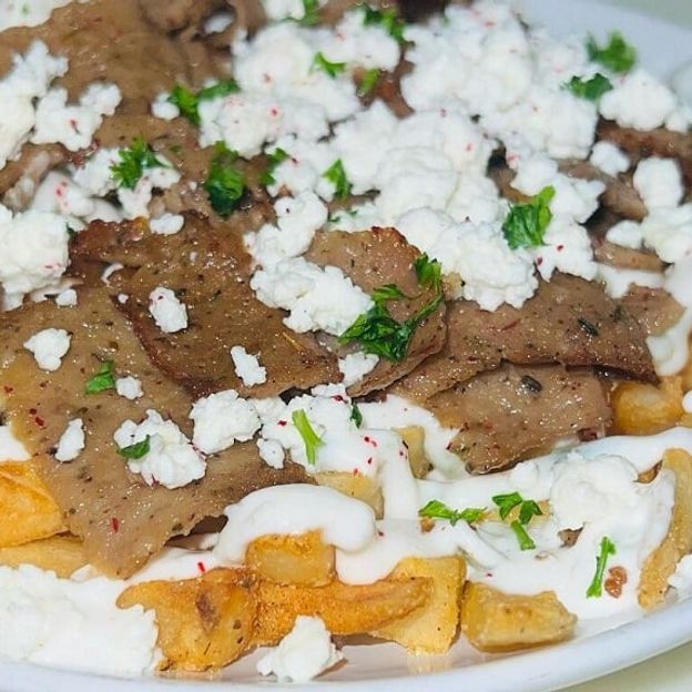 Fries topped with Shawarma Chicken, Garlic Sauce, Diced Tomatoes, and Mozzarella Cheese