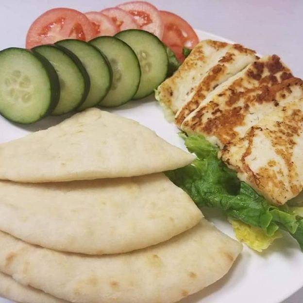 Slices of grilled halloumi on a toasted pita bread, with fresh cucumbers and tomatoes.