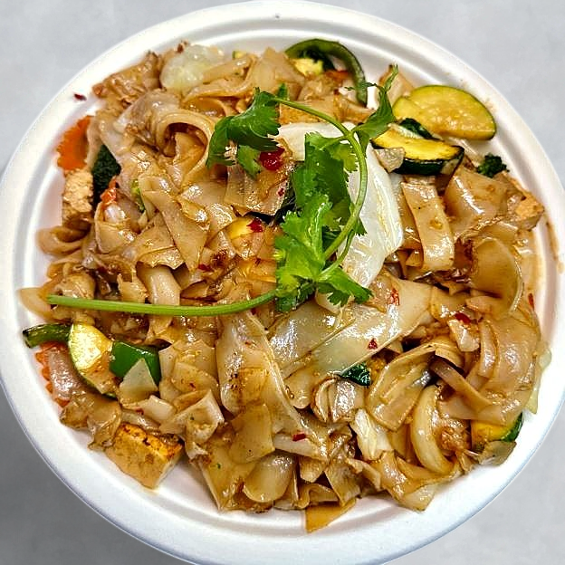 Flat pan-friend rice noodle, tofu, broccoli, bell pepper, carrots, white onion, basil leaf, brown sugar, vinegar, garlic and pepper in mushroom sauce.