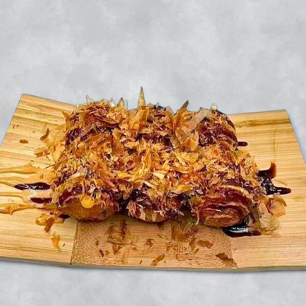 Crispy Japanese octopus balls topped with Takoyaki sauce,mayo,smoked bonito flakes and nori