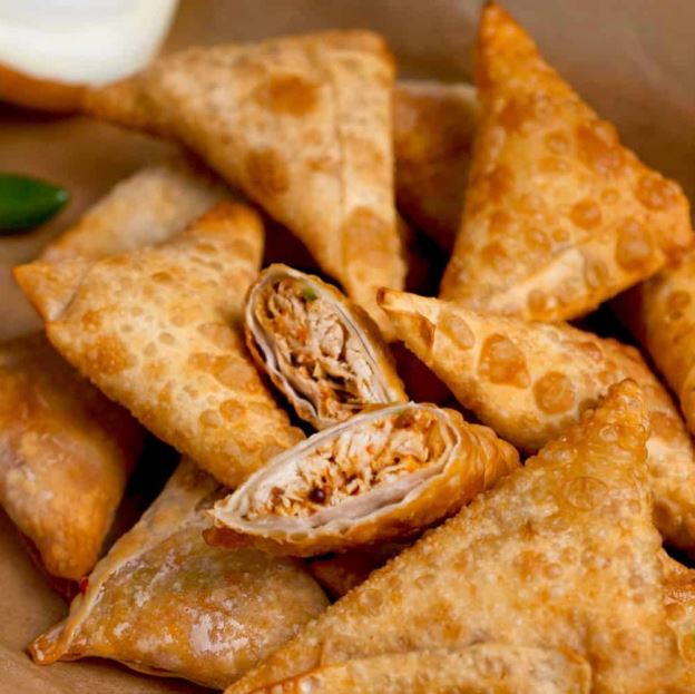Crisp triangular pastry filled with lightly spiced ground chicken and green peas.