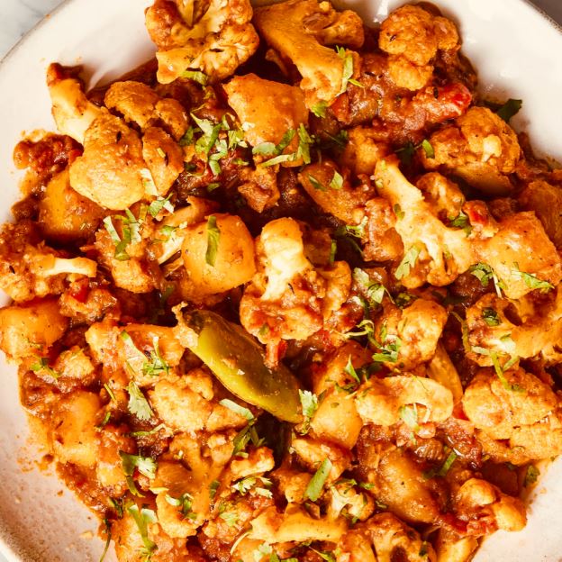 A delicious mixture of potatoes and chickpeas in yogurt and tamarind spicy sauce.