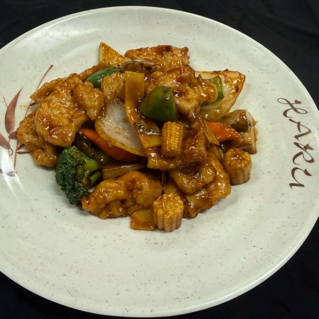 Tender white meat chicken, beef & jumbo shrimp sautéed with garden vegetable in garlic sauce