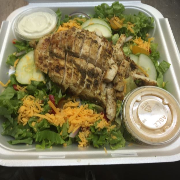 Spicy jerk chicken breast on a bed of fresh lettuce, cucumbers, tomatoes, carrots with delicious house dressings