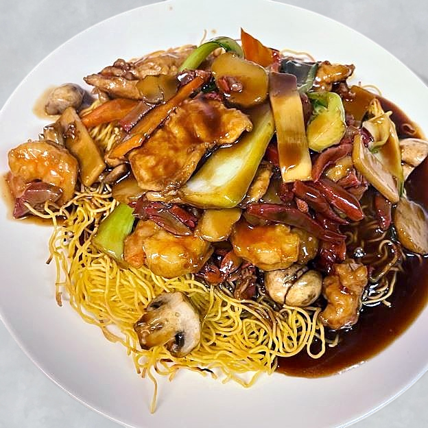 Sautéed jumbo shrimp, fish fillet & scallops with fresh Chinese vegetables in clear sauce & served on a sizzling hot plate