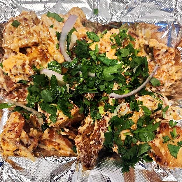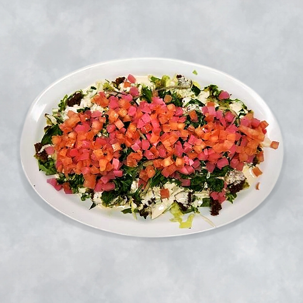 grilled eggplant served with onion,parsley,tomato and tahini sauce