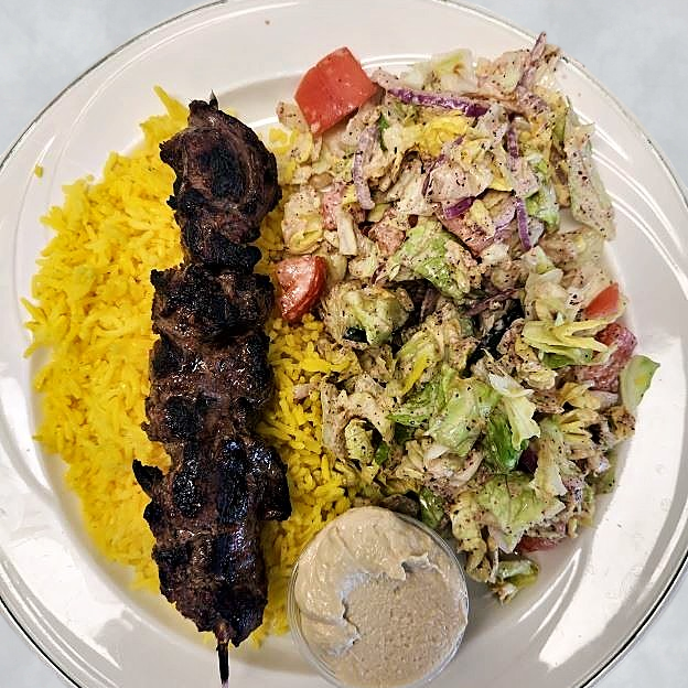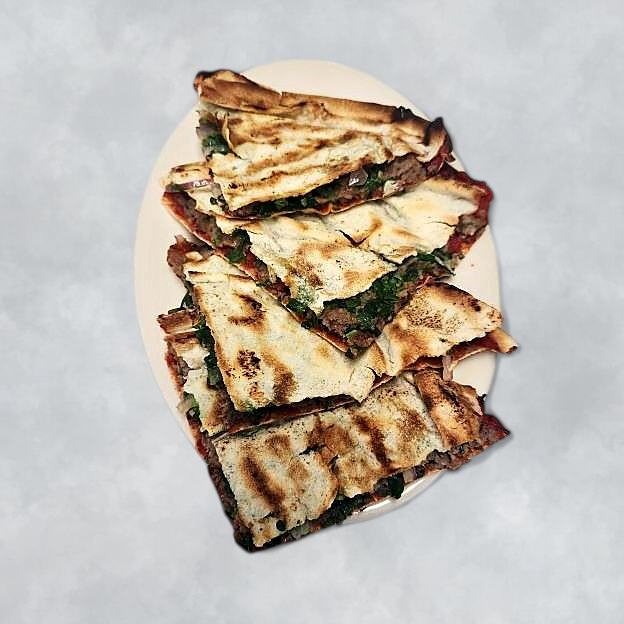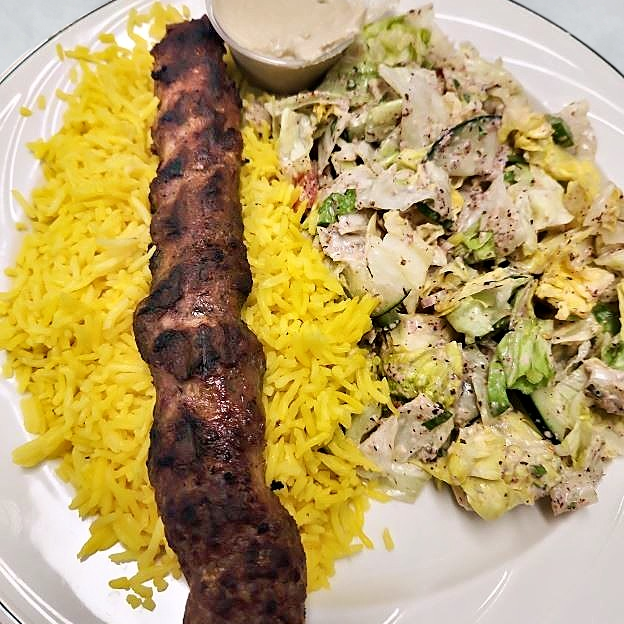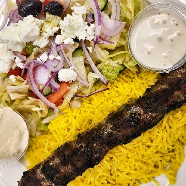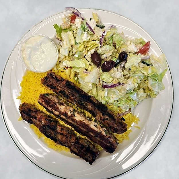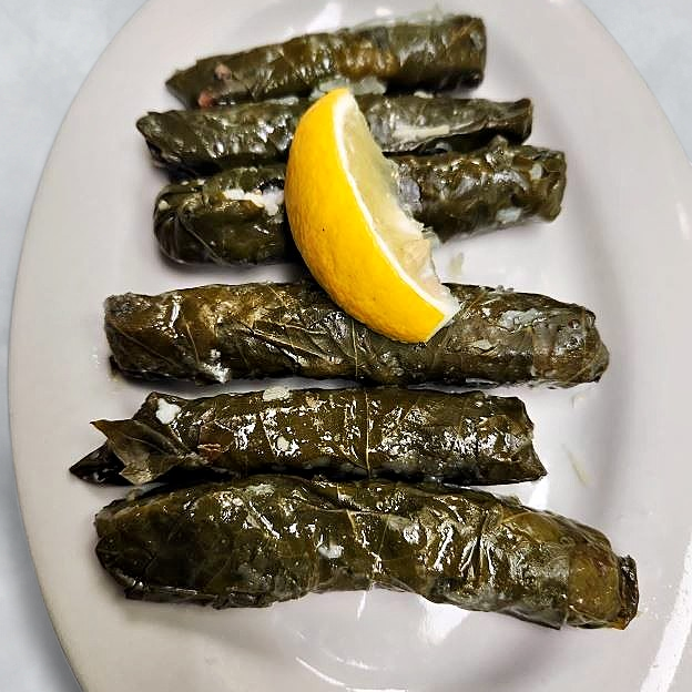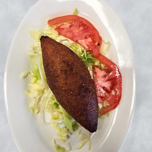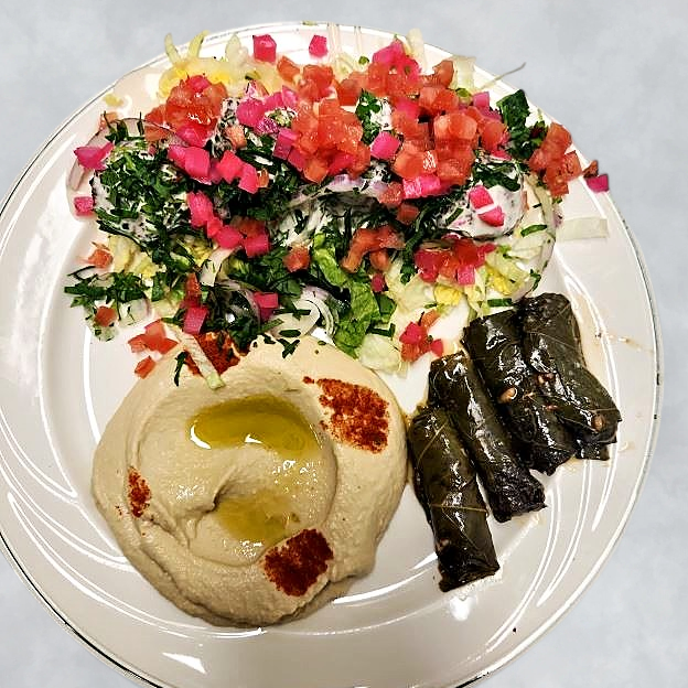 Combination of our home made kibbi ball, meat pie, meat grape leaves, and hummus, served with side pita bread