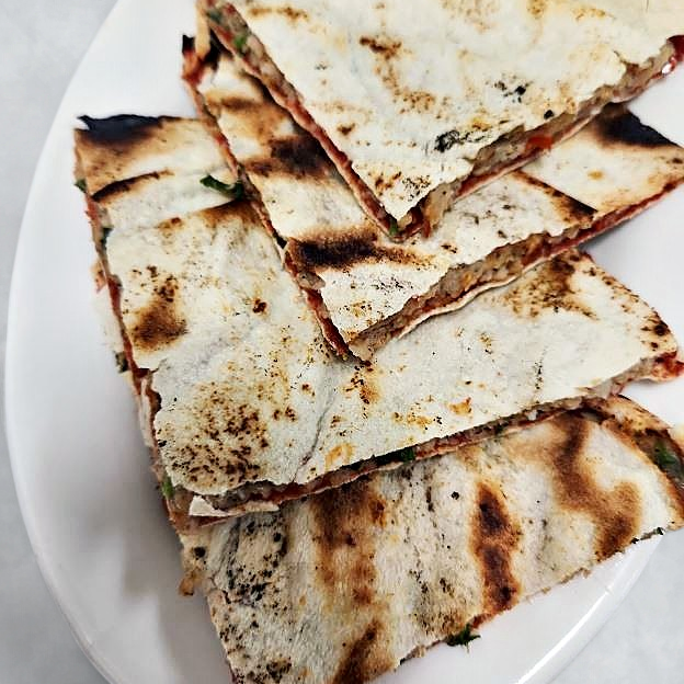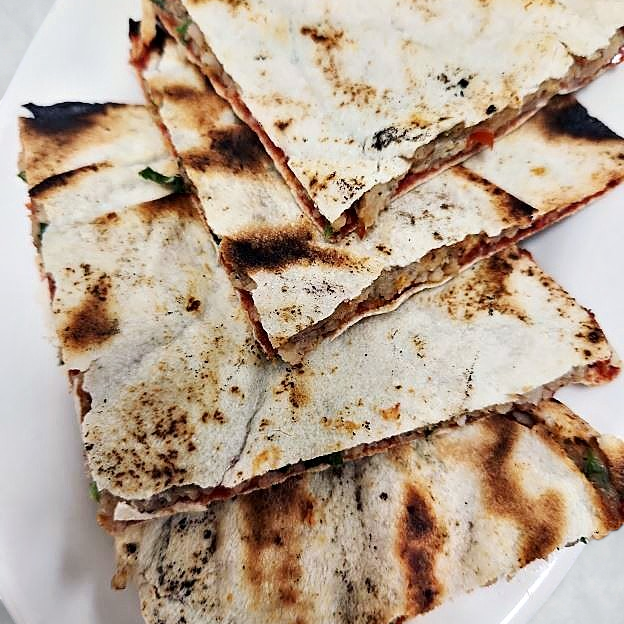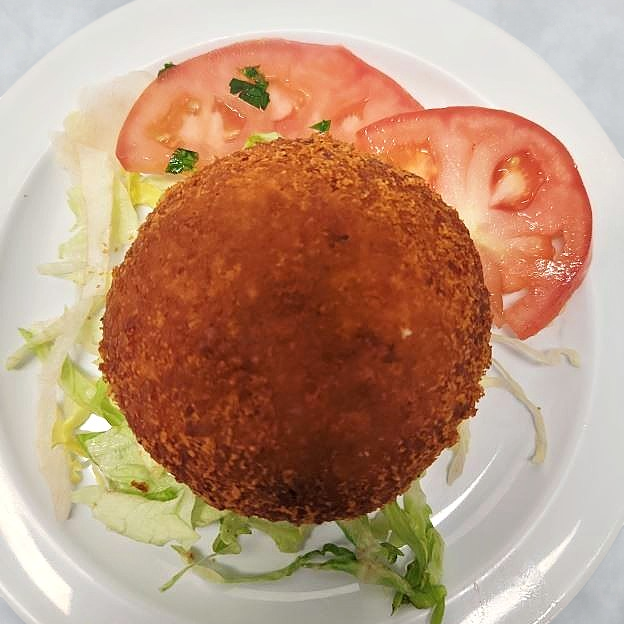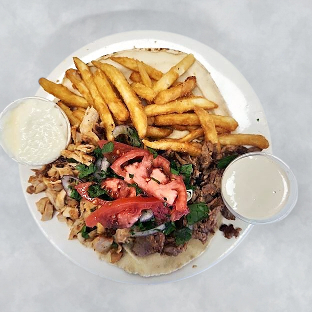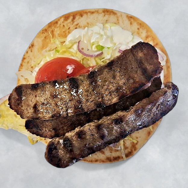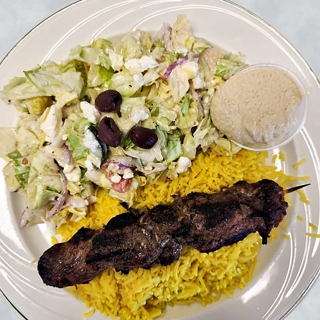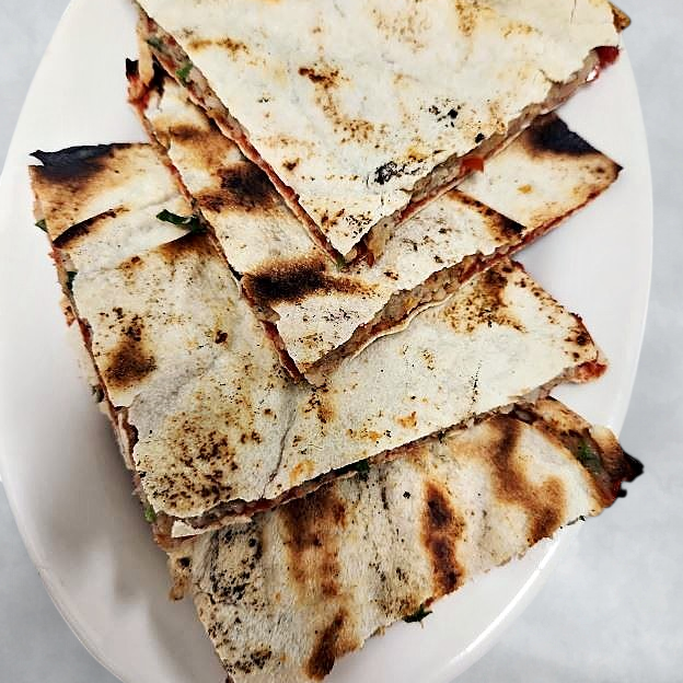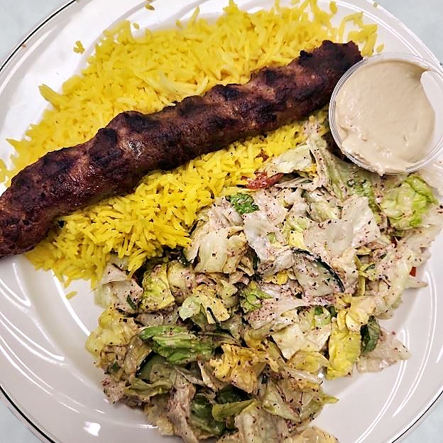 Combination of our home made kibbi ball, meat pie, meat grape leaves, and hummus, served with side pita bread