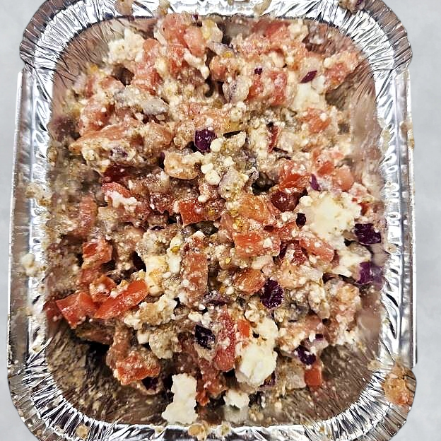 A mix of feta cheese, tomato, onion, olive oil and thyme seasoning.