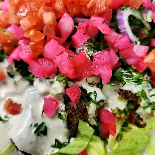 Our homemade hummus served with seasoned ground lamb and pine nuts