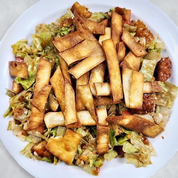 Chick peas topped with garlicy yogurt, pita chips, fried pine nut.