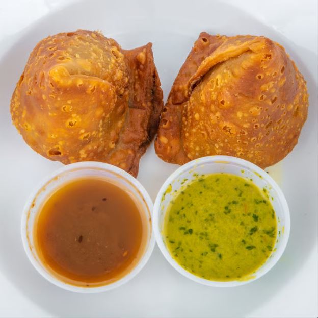 Mashed veg samosa topped with curried chickpeas, tamarind, mint chutneys and Indian yogurt.