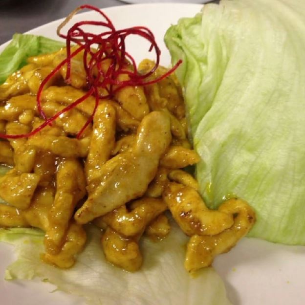 Sauteed slices of chicken with lemongrass served with peanut sauce and fresh lettuce.