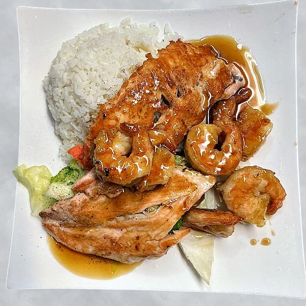 Served w/ 4 pcs of California Rolls, Garden Salad, Edamame & Rice, Homemade Ginger Dressing
