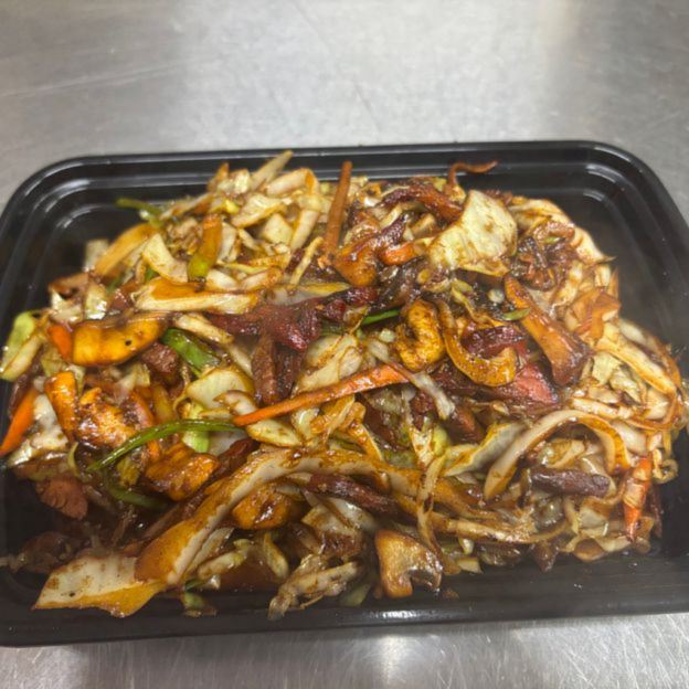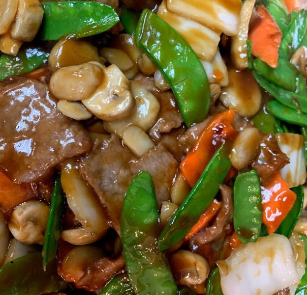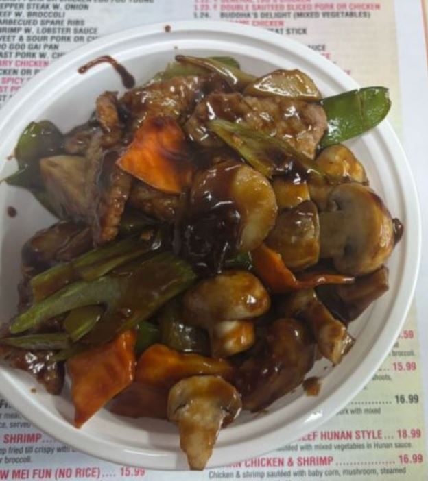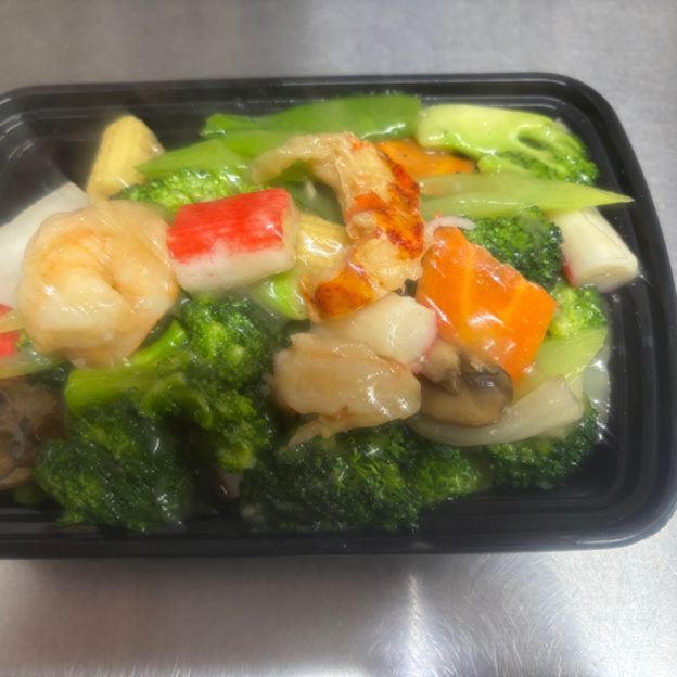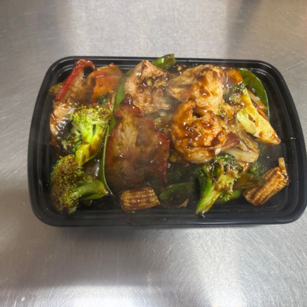 shrimp, chicken & beef sautéed with red pepper, bamboo shoots,mushrooms,waterchests & carrot in hot garlic sauce