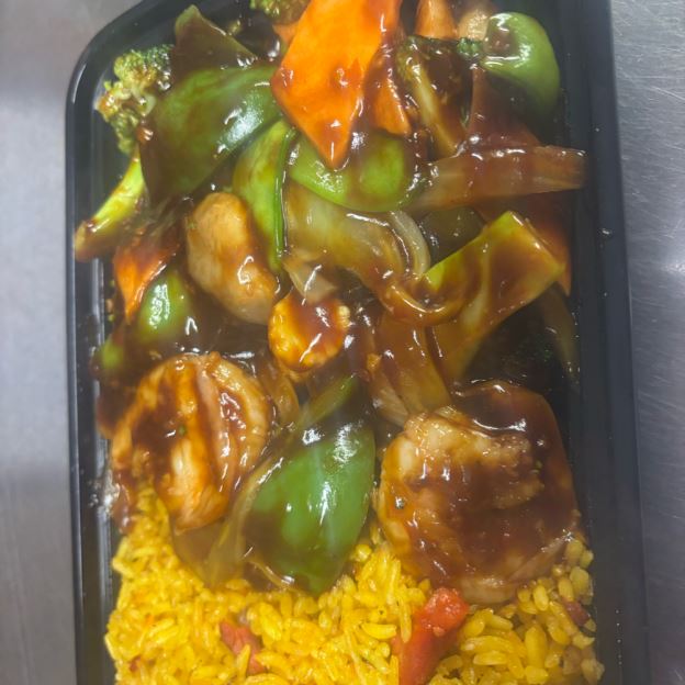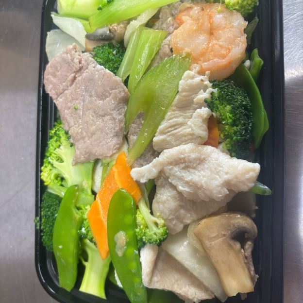 jumbo shrimp, tender beef, chicken & roast pork with mixed vegetables