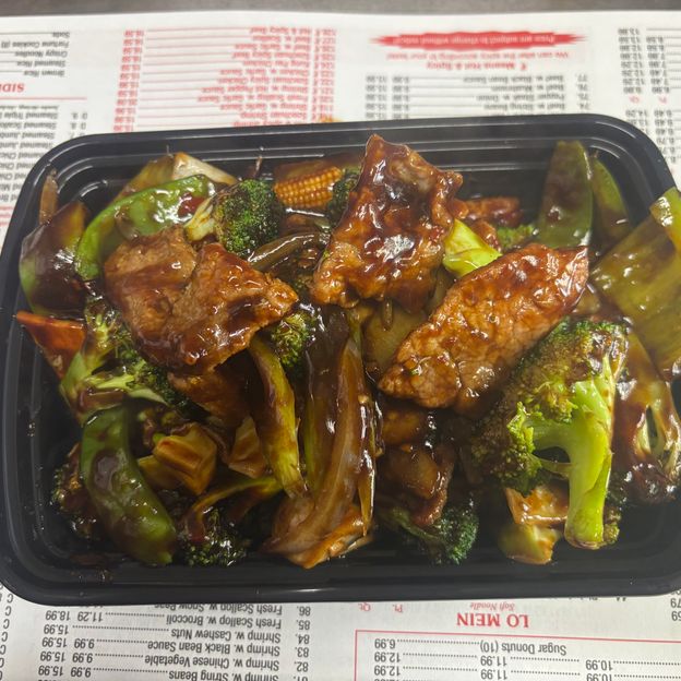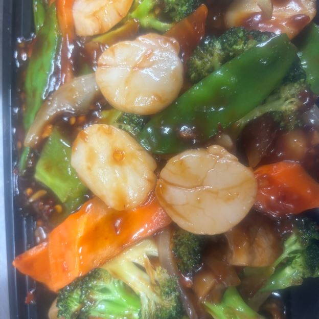 scallop & tender beef sautéed with mixed vegetables in Hunan sauce