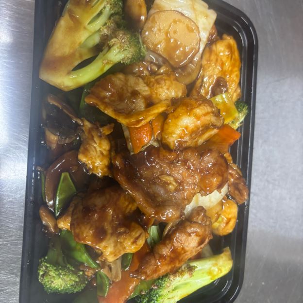 chicken & shrimp sautéed with baby corn, mushroom, steamed broccoli & snow peas in Hunan sauce