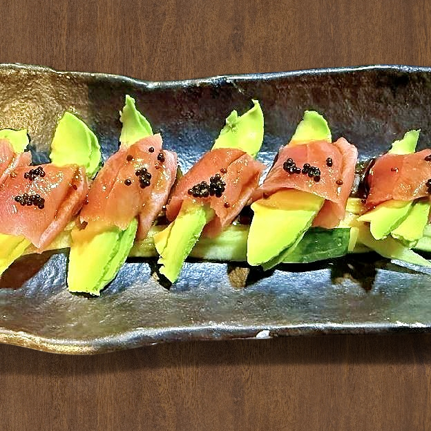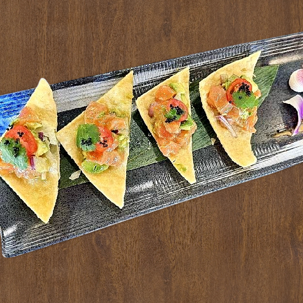 Fresh salmon,avocado,onions,tomate,cilantro,fish eggs, served over wontan chips