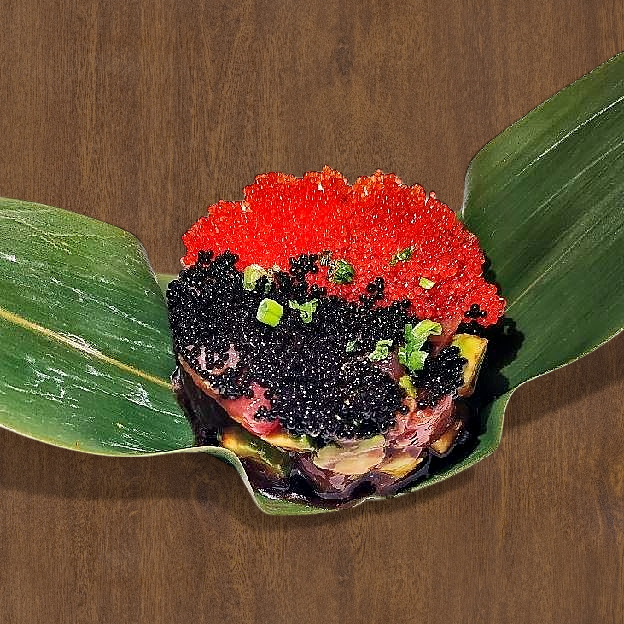 Crispy rice ball with spicy tuna, tobiko, avocado