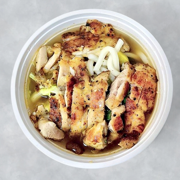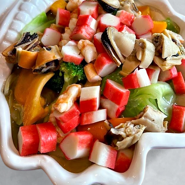 Clear soup with shrimp, crab stick, mussel, tofu, seaweed, green onion