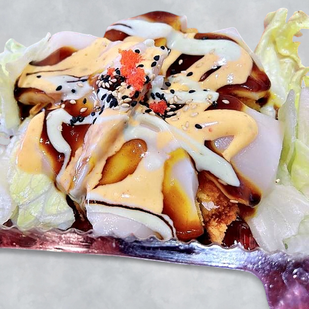 40 pcs sashimi: salmon, white tuna, snapper, shrimp, surf clam, crab stick, octopus 30 pcs sushi: salmon, white tuna, snapper, shrimp, crab stick, tuna, BBQ eel, surf clam, octopus, fish eggs. 50 pcs maki: California, Dynamite, BBQ eel, salmon, AC, white tuna, green dragon, spicy crunch