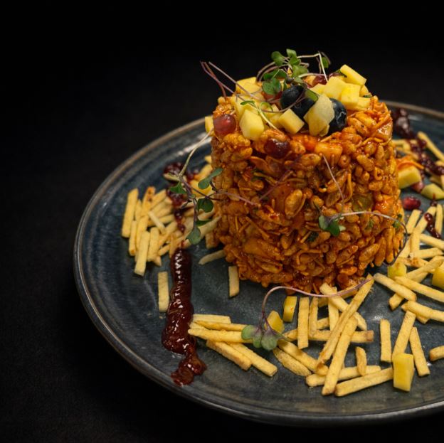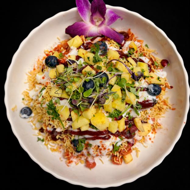 Chickpeas, Avocado, potatoes, raw mangoes & crisps tossed with a spicy sauce