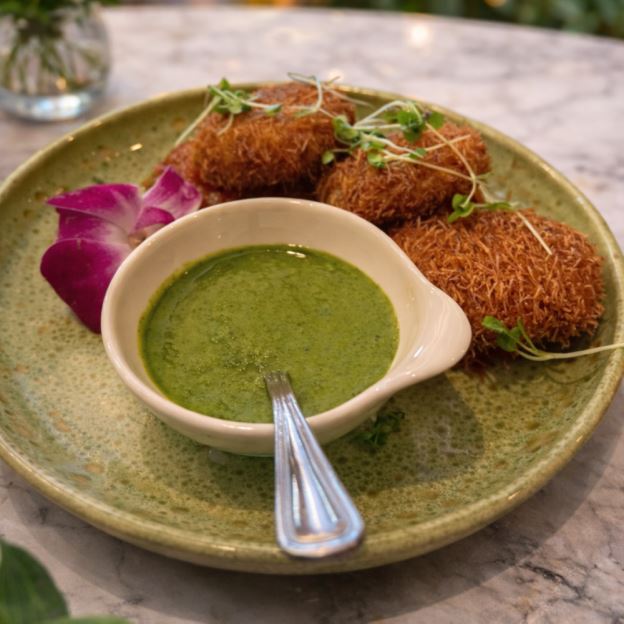 Yogurt dumplings coated with vermicelli & served with tomato chutney