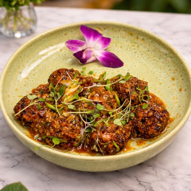 Deep fried mixed vegetable dumplings tossed in garlic soy sauce
