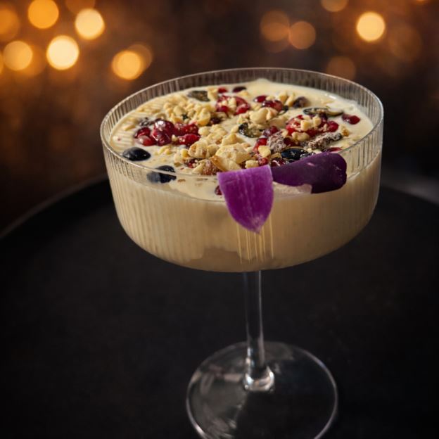 Cottage cheese dumplings cooked with skimmed milk, fresh mango puree & sliced almonds