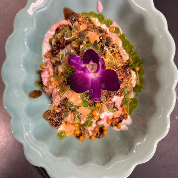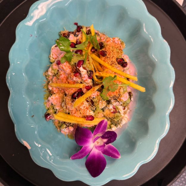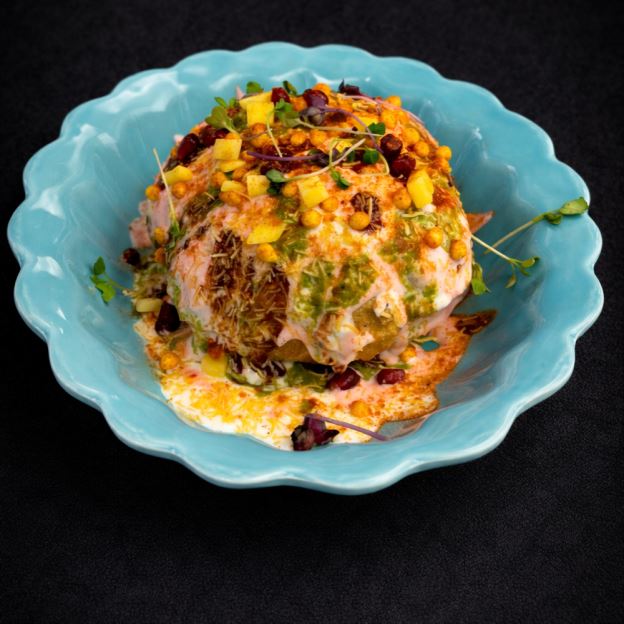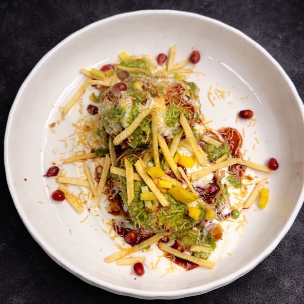 Crispy kale tossed with yogurt dressing, tamarind chutney, pomegrante & crunchy sev